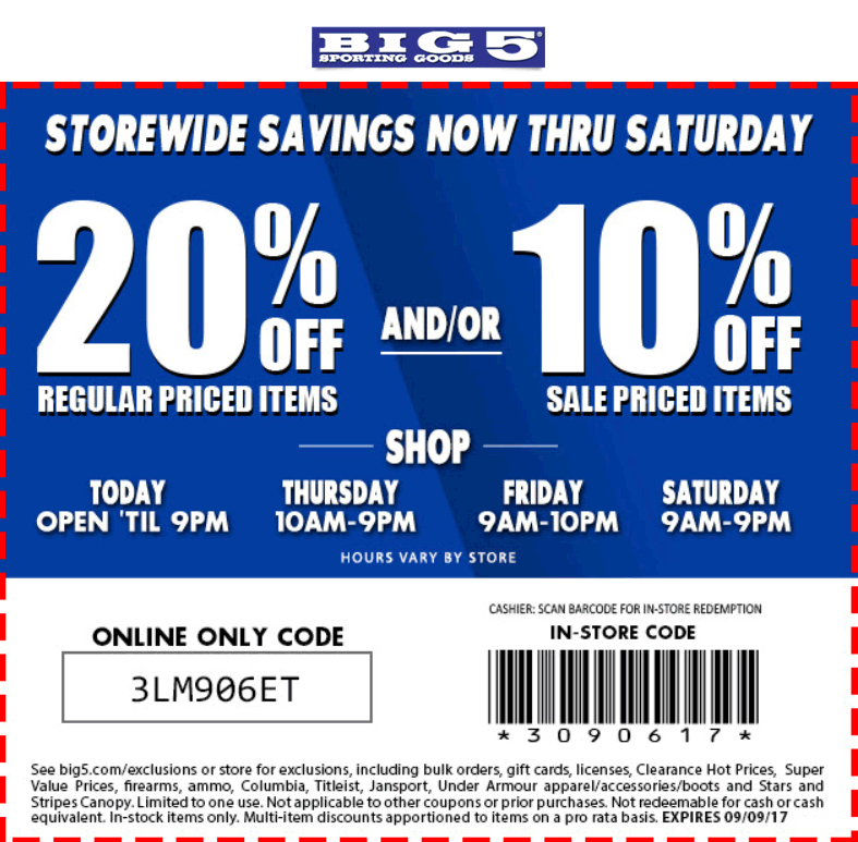 Big 5 frequently offers printable coupons on their website or through promotional emails. These coupons can be printed out and presented at the store during checkout to redeem the discount. The coupons may offer savings on specific products, a percentage off your total purchase, or even free shipping. By keeping an eye out for these coupons, you can score some great deals on your favorite sports and outdoor gear.